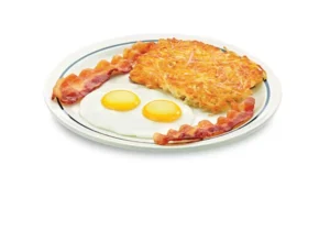 | Breakfast Sampler | $9.99 | 920 | A good breakfast, a combination of two eggs, two strips of bacon, two spears of sausage, and hash browns with pancakes. |